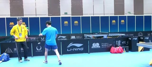 林诗栋独自对着挡板练发球,教练组在五米开外聊天。